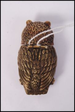 An unusual novelty brass vesta case in the form of an owl perching on a branch with yellow glass eyes.