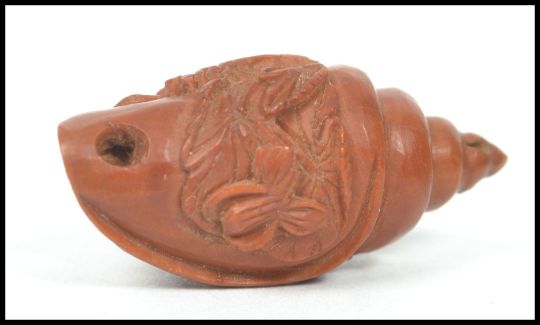 An Oriental miniature carved wooden netsuke in the form of a cornucopia nautical shell depicting two monkeys. Measures 3 cm long.