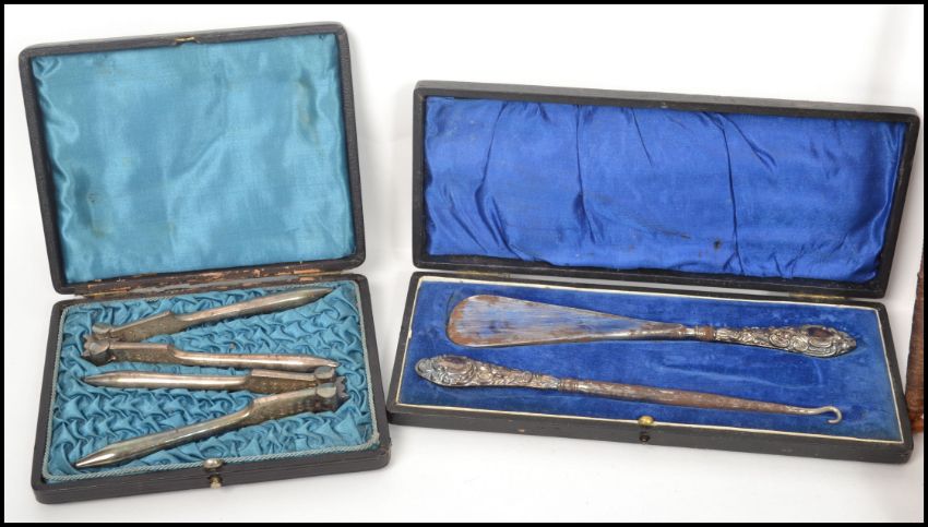 A presentation cased Victorian silver button hook and shoe horn together with cased nutcrackers, cigar box and other items etc. Cigar box measures 14 cm high, 30 cm wide and 19 cm deep.