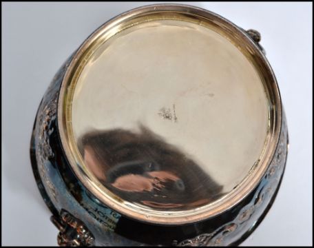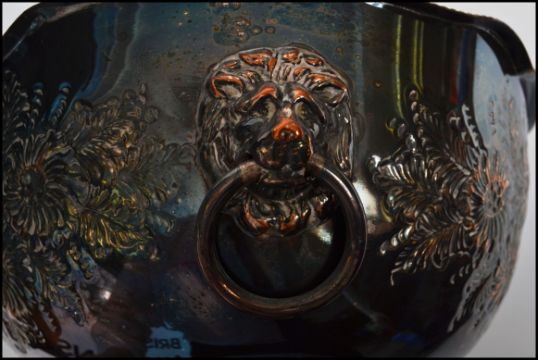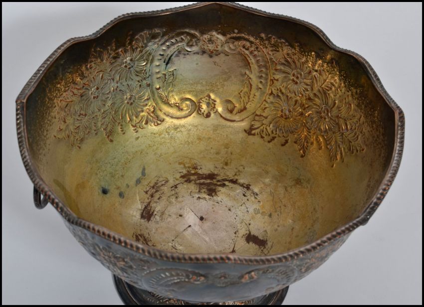 A stunning late 19th century silver plated fruit / punch bowl raised on a pedestal, having twin lion masks with loop handles having an ornate design. Measures 19cms high.
