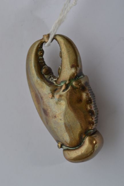 A late 19th century brass novelty vesta case in the form of a lobster claw clutching a pearl.