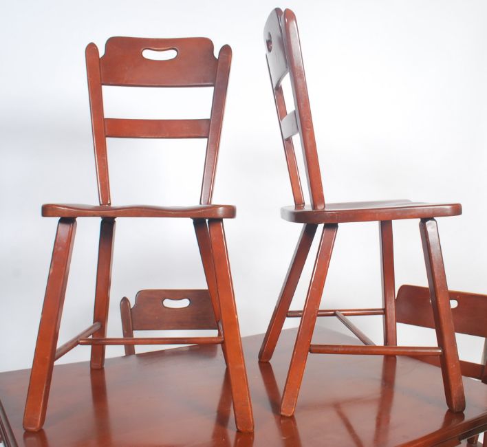 A 1950's Imperial Loyalist furniture, draw leaf dining table and 6 chairs bearing resemblance to Ercol. The utility style table having unusual mechanism to release the leaves and a 'X' frame stretcher and chairs having saddle seats and shaped back rest pierced section. Markings on the bottom for Imperial Loyalist made by Imperial rattan Co. Stratford Ontario.