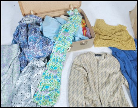 A collection of vintage and retro 20th century ladies clothes to include printed dresses, blouses, skirts etc. Contained within a retro suitcase.