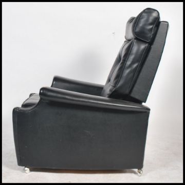 A retro 20th century 1960's black Parker Knoll recliner armchair. Button back seat and back rests, scroll arms and manual recline mechanism upholstered in a faux black leather. Measures: 33cm high x 42cm wide x 31cm deep.