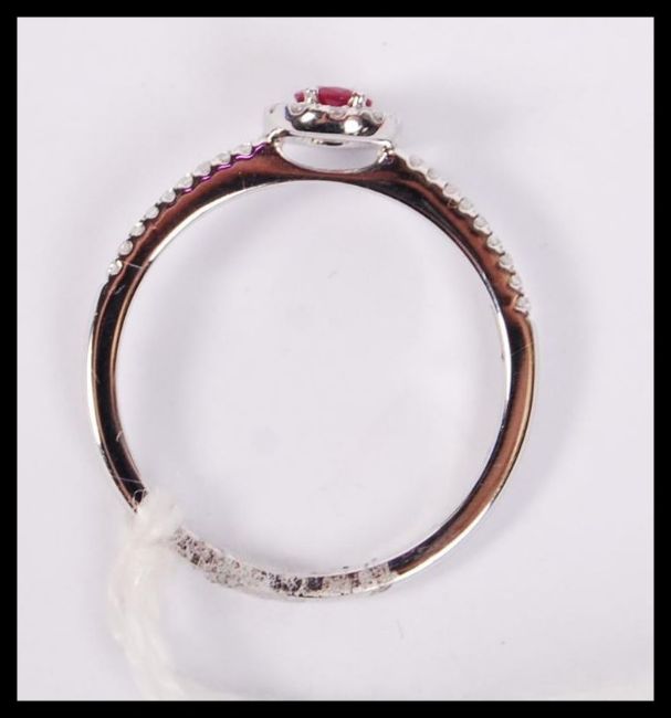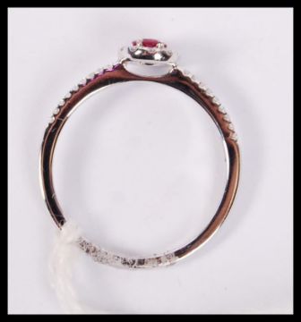 An 18ct white gold ruby and diamond cluster ring, having a central ruby adorned with a halo of diamonds. weighs 2.2 grams size N