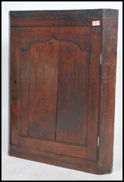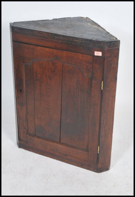 An 18th century Georgian solid oak country corner cabinet having single door with shelved interior within. Measures: 84cm high x 66cm wide x 39cm deep.