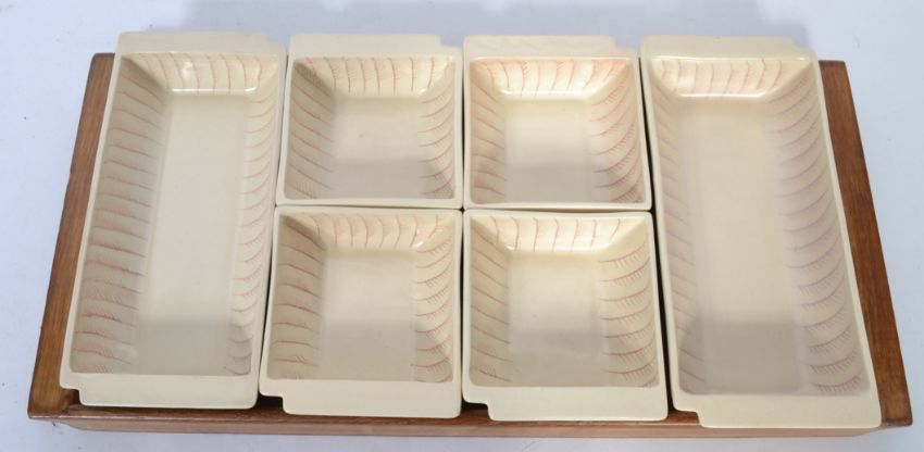 A vintage / retro 20th century Susie Cooper ceramic set of six sectional crudities / dips dishes on the original wooden carry tray. Measures: 5cm high x 49cm wide x 15cm deep.