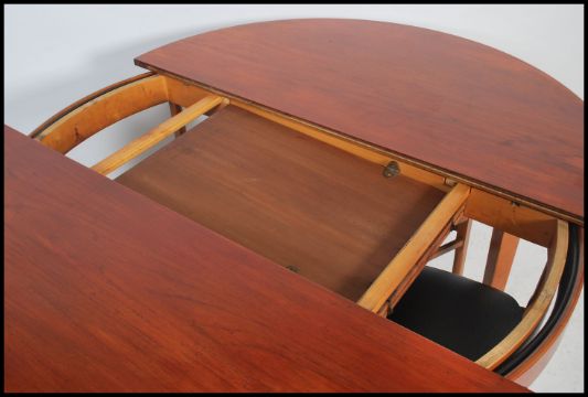 A good Danish manner retro 20th century teak wood dining room suite - table and chairs in the manner of Frem Rojle. The table of circular form with extending centre having set of 4 chairs with pad seats. Measures: 74cm high x 121cm diameter.