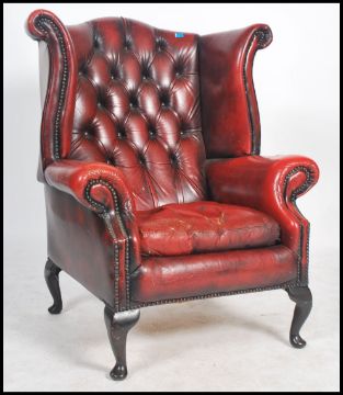 An antique style oxblood leather chesterfield armchair having barrel arms, raised on cabriole legs and upholstered in studded oxblood leather. Measures 106cms by 86cms by 80cms.