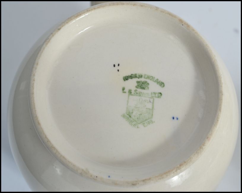 A vintage 20th century picture-ware jug by Lancaster and sons with shaped handle and lip and a band of coloured scenes of people, buildings, horse and cart etc. Green makers stamp to base. Condition report: In good order with no major damage or signs of cracks, chips repair etc. Some gilt ware. Measurements: 13 cm high and 18 cm wide.