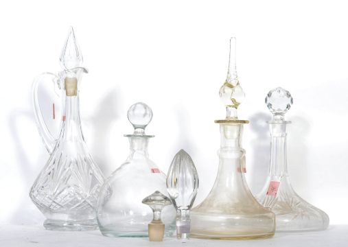 A group of early 20th century cut class decanters and claret jugs to include captains ship decanters, each having faceted glass stoppers. Measures: 39cm highest x 20cm diameter largest.