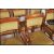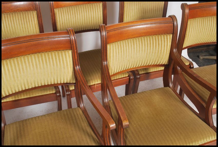 A set of 8 Regency revival mahogany dining chairs raised on sabre supports with velour drop in seats having 6 standard chairs complete with the 2 carvers
