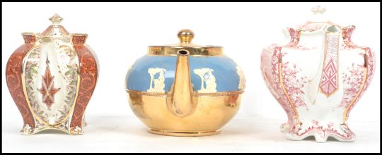 A Burleigh Ware teapot, circa 1894, with a chinoiserie scene of a lady in a garden holding a parasol and a gourd, Rd shape 223699, RdNo 225655. Together with another similar shaped teapot in red and white and a believed 19th century lustre glazed teapot of round form. Measures: 14cm highest x 27cm deepest x 15cm widest.