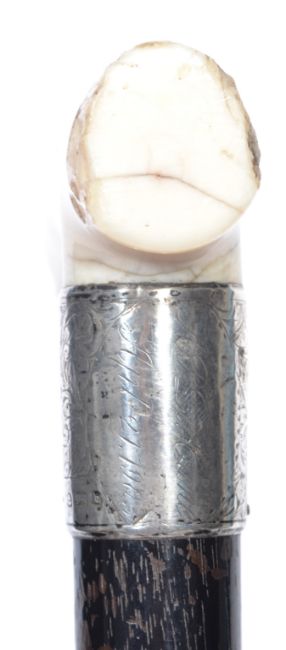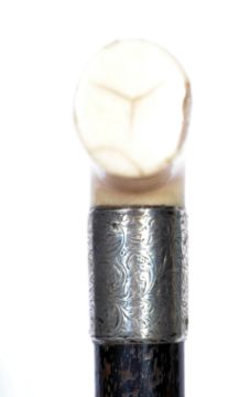 An ivory handled silver collared walking stick cane having a tapering ebonised shaft with shaped ivory handle, Hallmarked for Birmingham 1901, makers J Howell & Co Ltd.