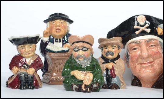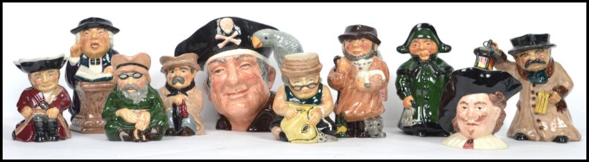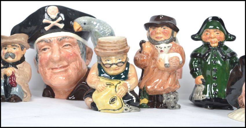 A collection of toby / character jugs dating to the 20th century to include Roy Kirkham Soldier 782, Tailor 781., Beadle, Shepherd, Night Watchman, Poorman, Vicar and others. Also Royal Doulton Long John Silver D6335 and a Sylvac Cavalier. Measurements:  17 cm highest and 22 cm widest.