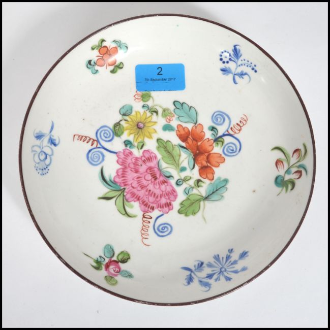 A believed early 19th century New Hall (Newhall) ceramic saucer dish with a central hand painted floral medallion with 6 varying floral sprays surrounding.  Red painted 1004 mark to base. Measures: 21 cm diameter.