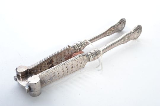 A pair of large Victorian 19th century silver plated marrow bone / lobster crackers, with scallop shell design and marks to base