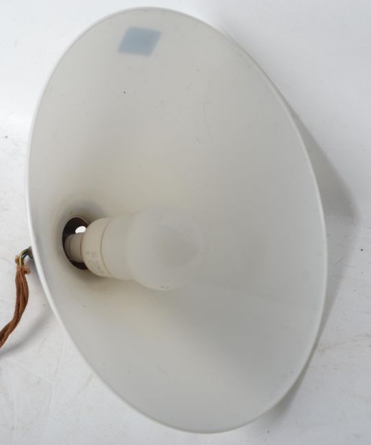 A vintage retro 20th century industrial rise and fall ceramic pendant light having a UFO type shade.
