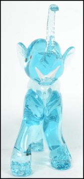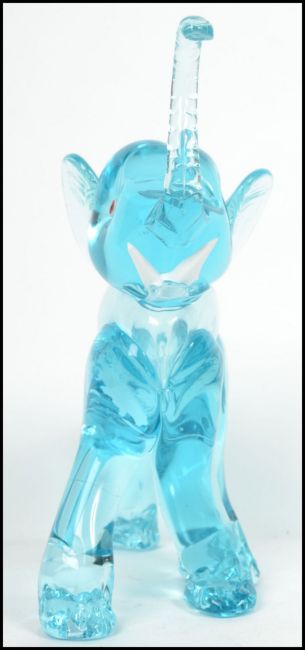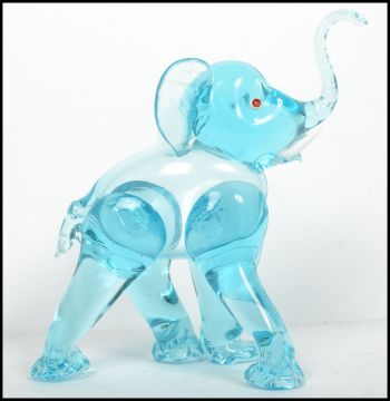 An unusual 20th century / 1960's retro glass elephant figurine. Blue glass with colourful eyes and white glass tusks. Measurements:  26 cm high, 12 cm wide and 26 cm deep.