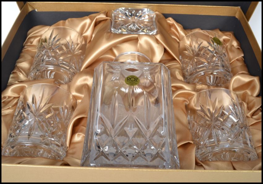 A cased unused Lead Crystal decanter and tumbler set, within original presentation box, by RCR / Royal Crystal Rock. Measures:  22cm high x 10cm deep x 10cm wide.