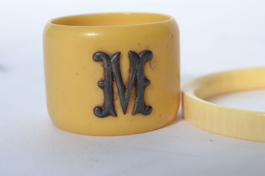 A 19th century ivory bangle with a gilt metal gold band together with an ivory napkin ring.