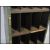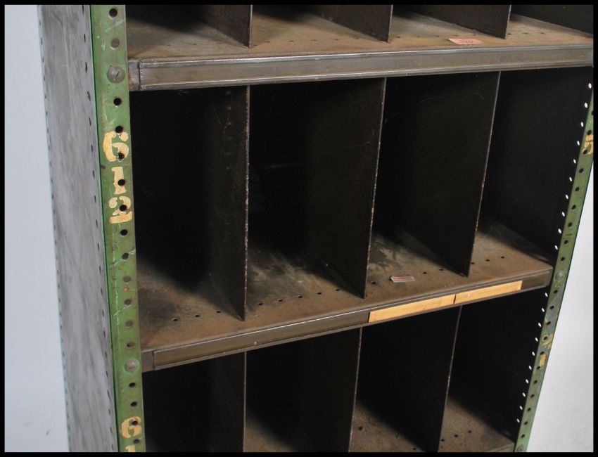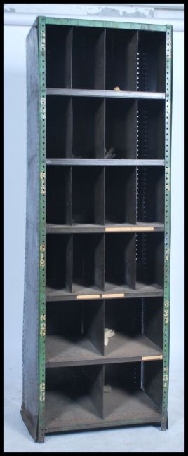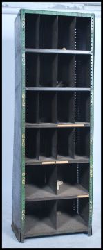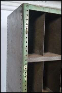 A slim original mid 20th century Industrial large green enamel metal sectional cubby cabinet. The cabinets each having larger multiple shelves with larger section dividers. Each cubby section having painted notation no's etc to sides. Ex Douglas motorcycle Factory. Measures: 191cm high x 62cm wide x 45cm deep.