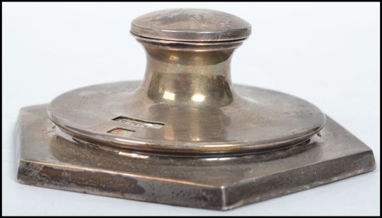 A silver hallmarked ink well desk calendar, set on an octagonal base surmounted with a hinged capstan ink well with revolving date adjuster. Birmingham assay mark, makers marks for Henry Williamson Ltd and dating to 1927. Total weight 276 g. Measures 5 cm high, 11 cm wide and 14 cm deep.
