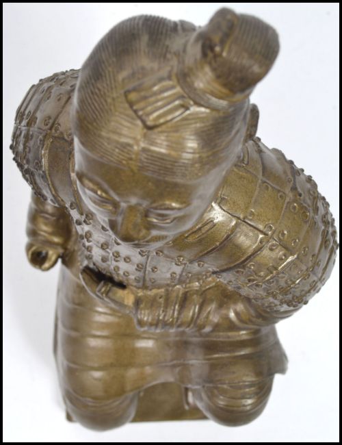 A large gilded plaster Chinese figurine of a terracotta army soldier in the kneeling  position, raised on plinth base with Chinese character marks to the base