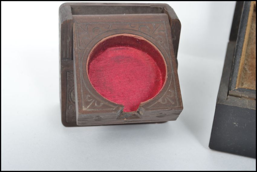 A collection of pocket watch stands to include treen examples, Victorian flip out inlaid ebonised example and a modern hardwood and brass case. Measurements:  7 cm highest, 7.5 cm widest and 11 cm deepest.