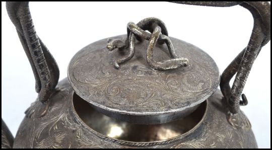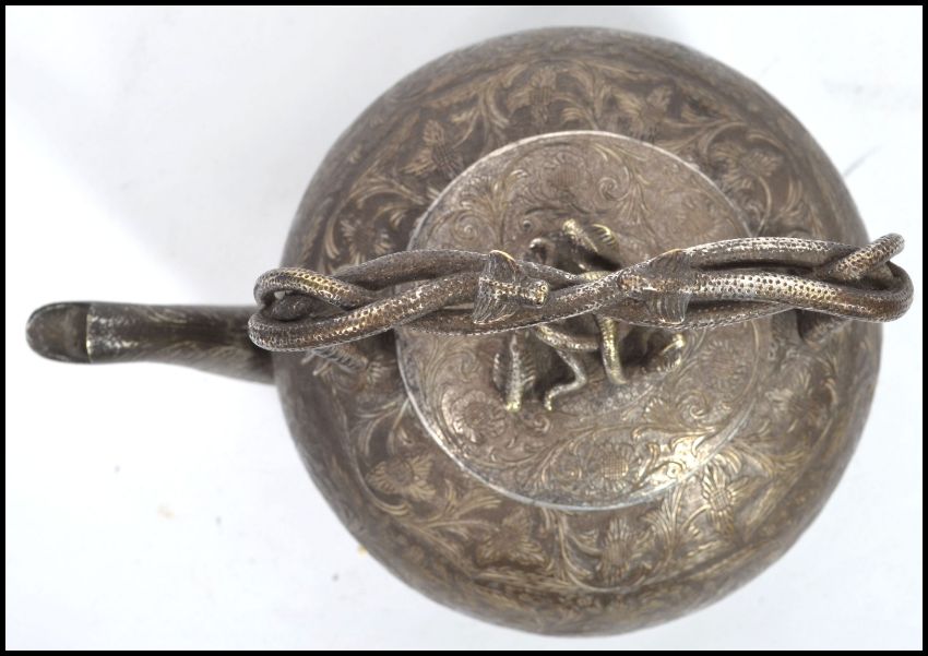 A vintage early 20th century silver white metal Persian / Islamic tea pot having an chased decorated bulbous body with snake cobra handle and finial to lip. Measures: 16cm high x 18cm deep x 13cm wide.