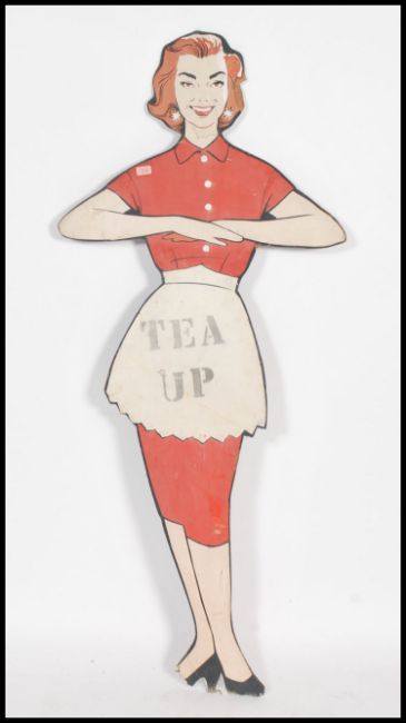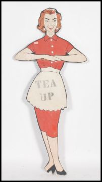 A 1950's large wooden handpainted advertising sign in the form of a lady waitress with notation panel  for ' Tea up! ' Measures: 172cm high x 75cm wide.