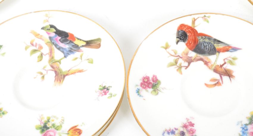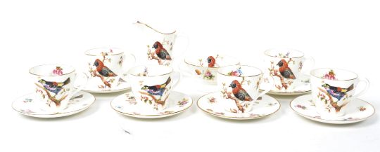 A 1920's Royal Doulton ceramic coffee service consisting of cups saucers, creamer jug and sugar bowl decorated with Exotic birds of paradise and floral swags. Stamped to base with red painted H1222.