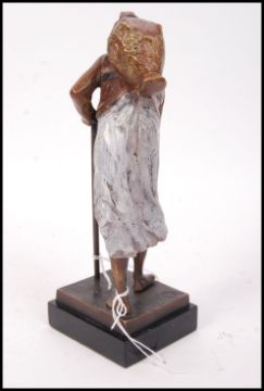 A cold painted bronze figurine of an Arab figure carrying water with bowl and cane raised on a bronze plinth base mounted a black marble plinth, foundry marks to base.