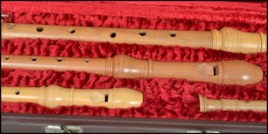 Musical Instruments: A cased compendium set of fruitwood recorders by Erich Hellinger, in a fitted carry case, comprising sopranino, descant, treble and tenor recorders Longest measures 65 cm.