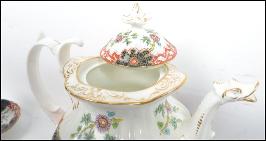 A good early 20th century tea service in an Imari pattern with bubble decorations. The set comprising large teapot, cups, saucers, sugar bowl and a  non related but similar creamer