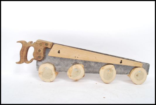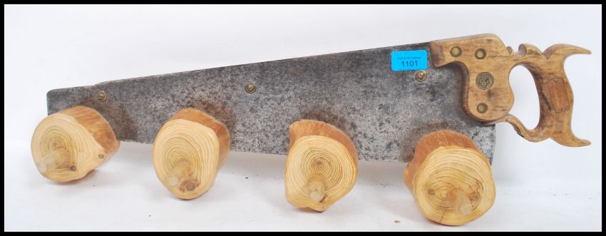 A vintage 20th century coat hook constructed from a saw with log shaped pegs. The saw having a makers plaque for Spear and Jackson.
