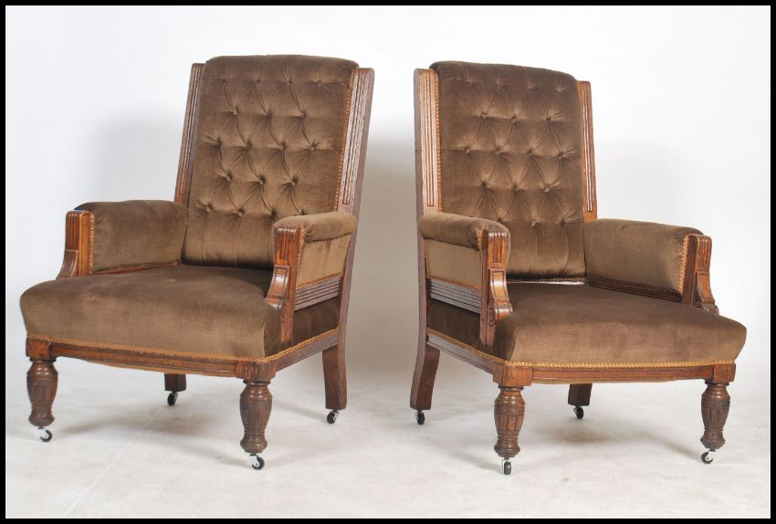A good pair of Victorian oak gallery back ladies and gents armchairs  being raised on turned legs with brown velour upholstered overstuffed seats and back rests with gallery arms. Matching sofa settee in lot 1330 Measures 103cms by 70cms by 72cms.