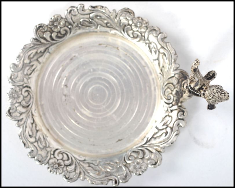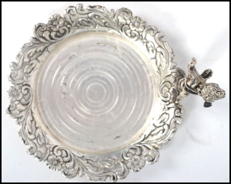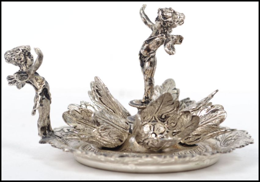 An Italian silver plated miniature centre piece having a foliate swirl border with central five flower piece with fairy / cherub finial to top. Stamped ARG 1000. Measures: 5cm high x 10cm deep x 8cm wide.