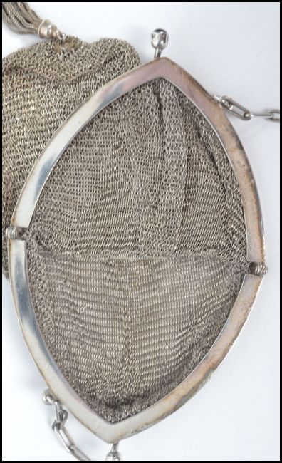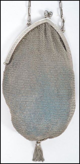 An early 20th century Alpaca silver white metal ladies evening purse of mesh construction with blue stone clasp and chain to top.. When fully extended measures 34 cm long.