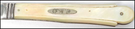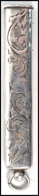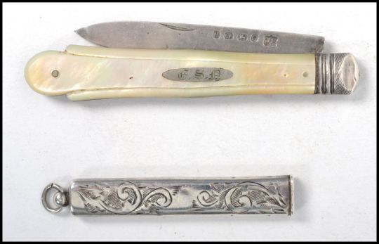 A 19th century silver hallmarked penknife of larger form having a shaped monogrammed mother of pearl handle, hallmarked for Birmingham 1865 makers James Fenton along with a silver hallmarked pencil holder having chased decoration, hallmarked for Birmingham 1907 makers Francis Webb, individual weight 19.6 grams and 1.5 grams. Measures: 14cm long.