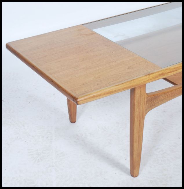A 1970's retro G-Plan teak wood coffee table of rectaugular form raised on tapering legs with lower rack under inset glass top above
