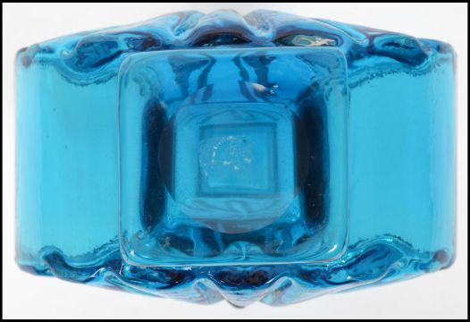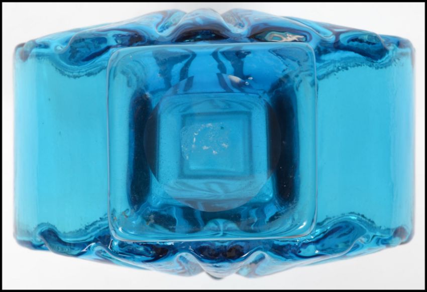 A mid century Geoffrey Baxter for Whitefriars studio art glass Sunburst pattern vase in the kingfisher blue colourway having a moon shaped body with square tapered rim and polished pontil mark to base. Measurements: 16 cm high, 13 cm wide and 6 cm deep.