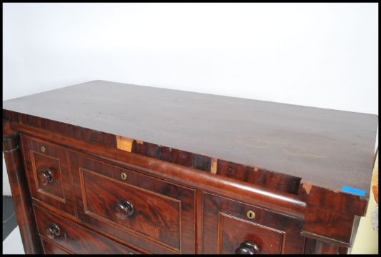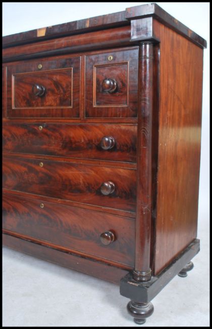 A large Victorian mahogany Scottish chest of drawers being raised on turned legs with column sides. The chest comprising a series of short drawers flanking a central hat drawer with graduating drawers beneath. Flared top above with knob handles to the drawers. Measures 125cms by 130cms by 62cms.
