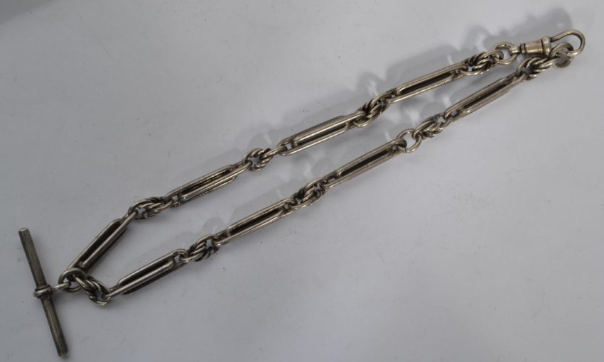 A silver hallmarked pocket watch Albert chain, Measures twelve inches with T bar. Date letter C with makers H.P, weighs 42 grams.