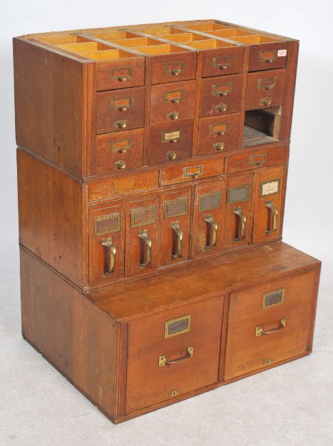 An early 20th century Industrial oak Shannon Cabinets modular filing system having 3 parts comprising large 3 drawer filing cabinets, multi index drawers cabinets and a section of upright folder cabinets. Each with pull handles, notation slides etc and comes with the original Shannon catalogue for the sections available