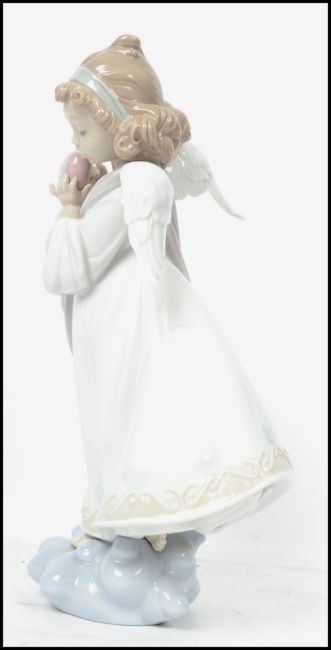 A Lladro ceramic figurine entitled ' Loving The World '  depicting an angel with flowers to hair raised on a cloud base holding a heart. Impressed 6870 marks to base. Measures:  30cm high x 16cm deep x 13cm wide.