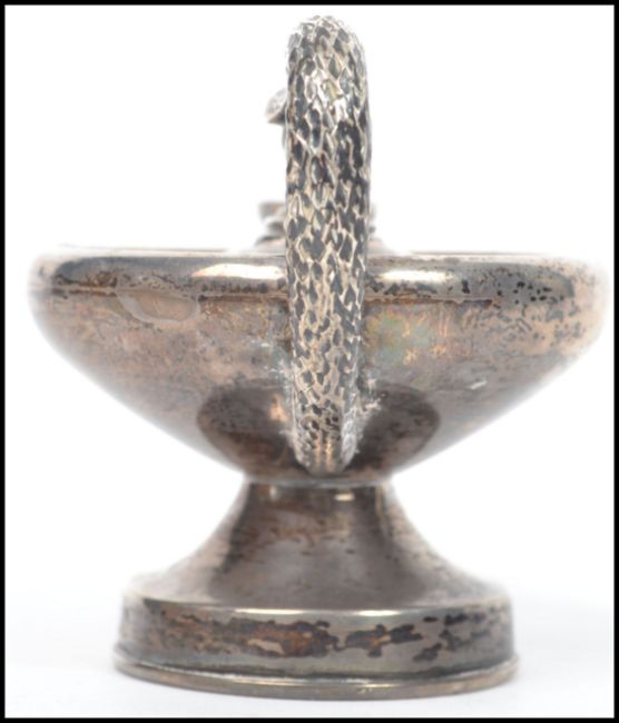 A silver ornate hallmarked Genie's Aladdin lamp oil burner with serpent head handle, bearing marks for London, date letter b, possibly John Batt 1897. Total weight 220.3g / Size 12cms long