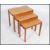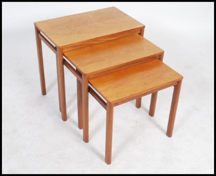 A 20th century retro teak wood nest of graduating occasional tables, each table raised on square shaped legs united by stretchers. Measures:  56cm high x 62cm wide x 31cm deep.