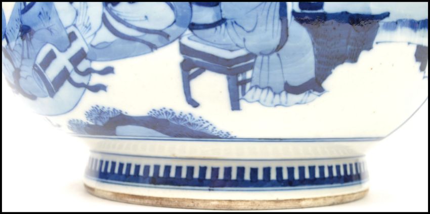 A large Chinese 19th century Kang-xi  long neck vase of bulbous form having raised foot.  This blue and white piece is heavily decorated with scholars and court scenes. Measurements: 41 cm high and 23 cm diameter.