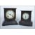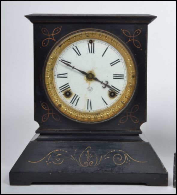 Two early 20th century black marble slate mantel clocks, one by Ansonia of America, having faceted hands. Highest measures 26 cm , widest measures 25 cm and deepest measures 12 cm.